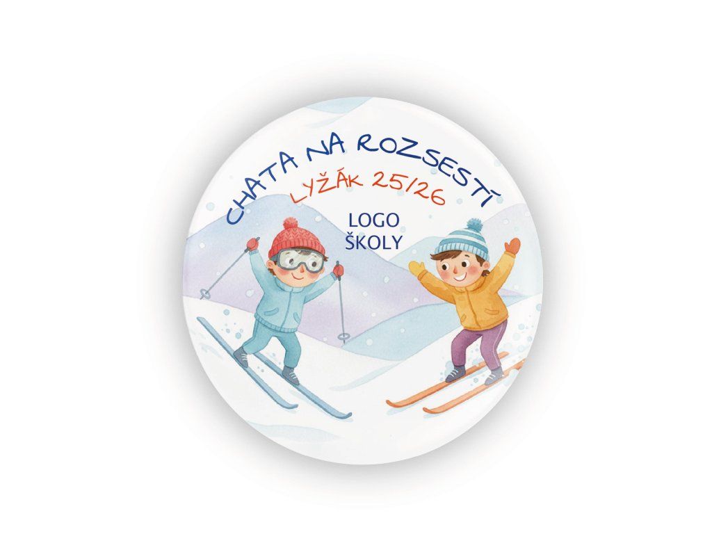 Na placku doplníme název chaty, školu, rok (např. 2025/2026), třídu i logo školy. Vytvoříme tak jedinečný motiv přesně pro váš lyžák – třeba „Chata Na Rozcestí“, „Horská bouda U Sjezdovky“ nebo jiný název podle skutečného místa pobytu.