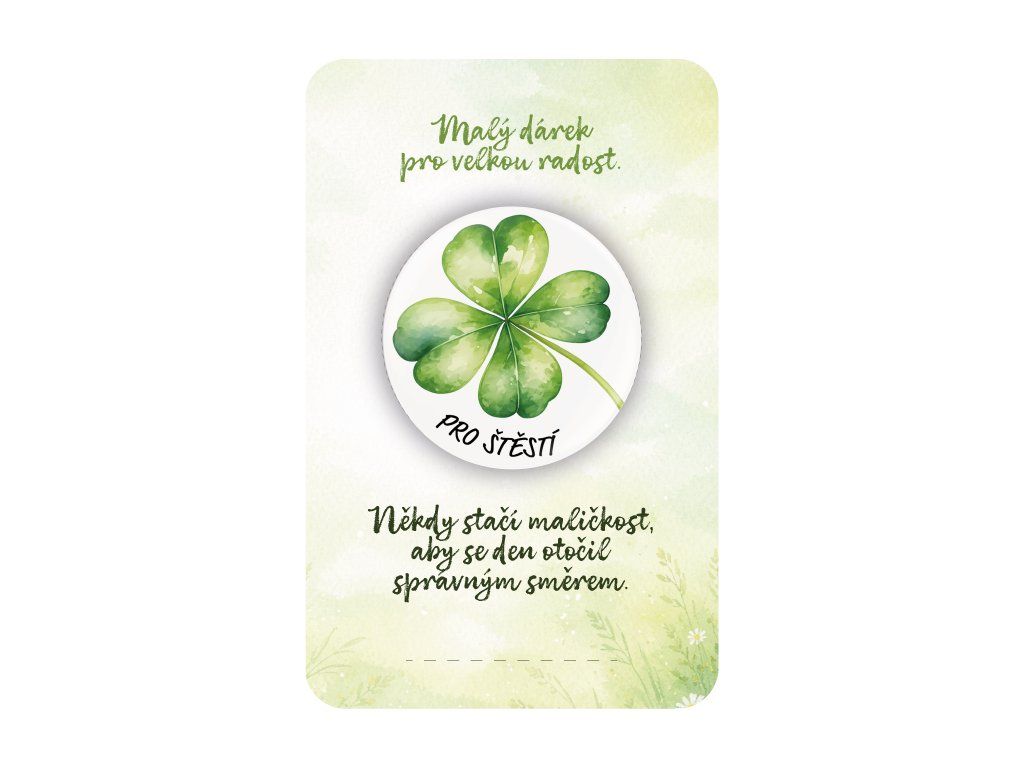 Placka „Pro štěstí“ s dárkovou kartou je drobný dárek s velkým významem. Symbol čtyřlístku přináší naději, štěstí a pozitivní energii do každého dne.