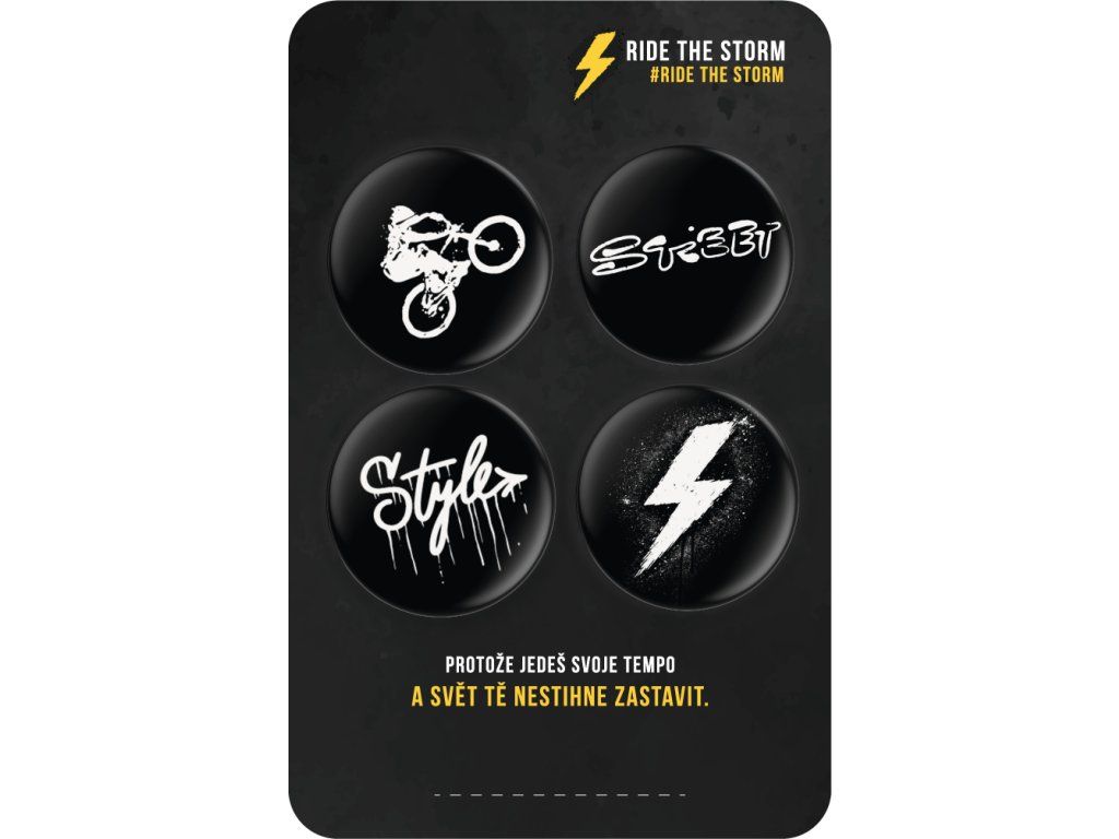 RIDE THE STORM je sada čtyř placek inspirovaná street kulturou, pohybem a energií, která se nezastaví. BMX silueta, výrazný nápis, surový „Style“ a ikonický blesk tvoří kolekci pro ty, kteří si určují vlastní tempo.