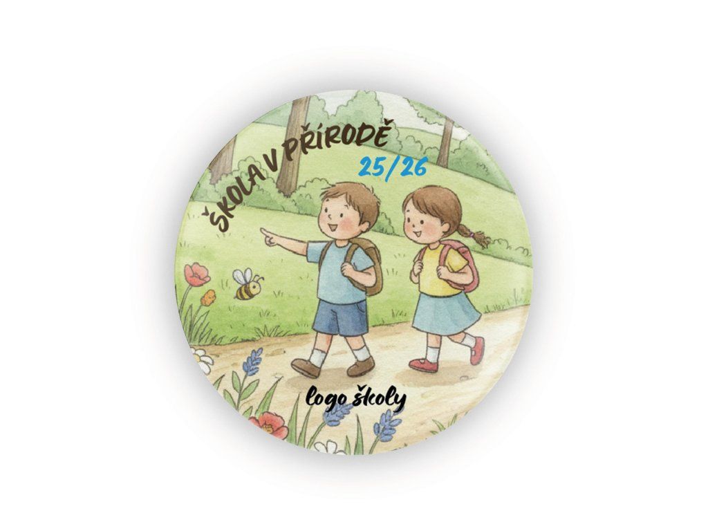Placka Škola v přírodě je milou vzpomínkou na společné dobrodružství mimo školní lavice. Motiv dětí na cestě krásně vystihuje atmosféru výletů, her, objevování přírody i nových přátelství.