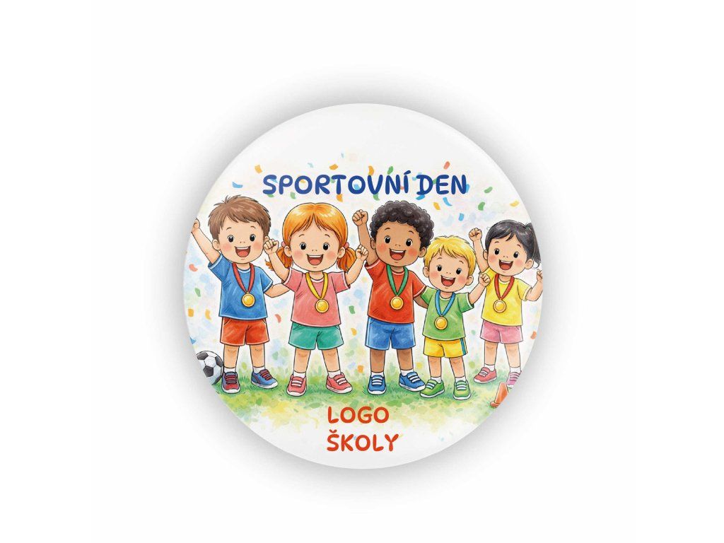 Placka Sportovní den je veselá odměna pro malé sportovce, kteří si zaslouží medaili za snahu i výkon. Barevný motiv dětí s medailemi krásně vystihuje atmosféru školního sportovního dne, soutěží i olympiád.