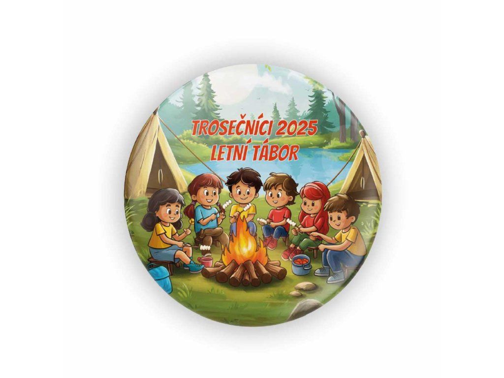 Placka Trosečníci 2025 – Letní tábor je skvělou památkou na společné dobrodružství plné her, přátelství a táborových zážitků. Motiv s dětmi u táboráku krásně vystihuje atmosféru léta, týmové spolupráce a nezapomenutelných prázdninových chvil.